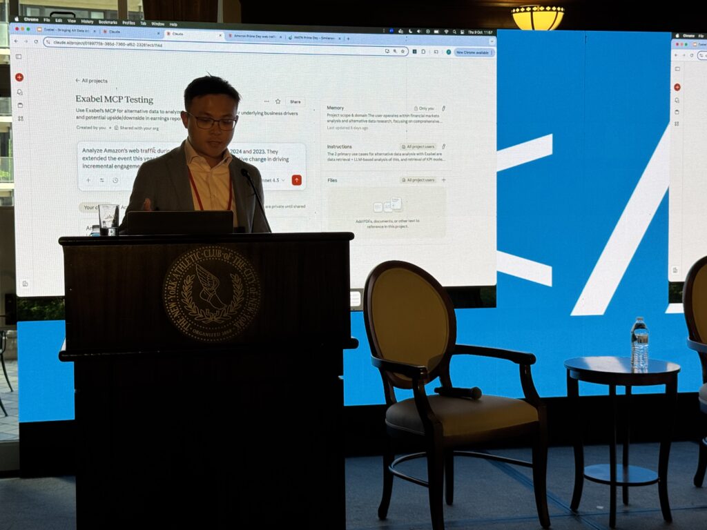 Zac Yang, VP Product, took to the stage to give the audience an overview of how Exabel is seamlessly bringing alt data into agentic workflows, emphasising the potential issues that can arise when unstructured alternative data is given to AI agents.
